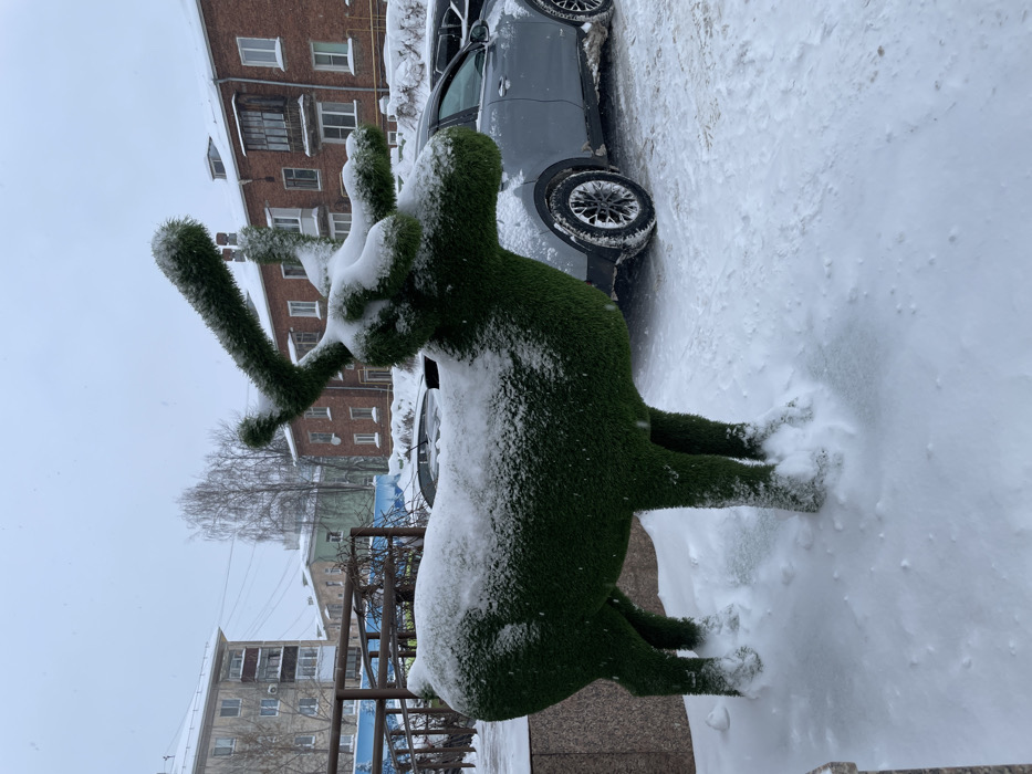 The image displays an outdoor urban scene in Izhevsk, Russia, under an overcast sky with ongoing or recent light snowfall. In the foreground, a large topiary sculpture, crafted from green artificial turf and shaped like a deer or reindeer, stands on a snow-covered paved area. Its back, head, and prominent antlers are dusted with fresh snow, contrasting with the green material. Behind the sculpture and to the right, a silver-grey SUV is parked, its lower half and wheels partially obscured by accumulated snow. To the left, a dark brown metal fence or railing is visible. The background consists of multiple multi-story residential buildings. On the right, a prominent brick-red building with white-framed windows and a dark, enclosed balcony structure is present. To the left, a lighter-colored residential building with several visible balconies appears. Between these structures, a greenish-blue building is partially visible. Bare deciduous trees, devoid of leaves, are scattered throughout the background, indicating winter conditions. The entire ground surface is covered in a layer of white snow. No individuals are visible in the scene, and no active interactions or movements are depicted.