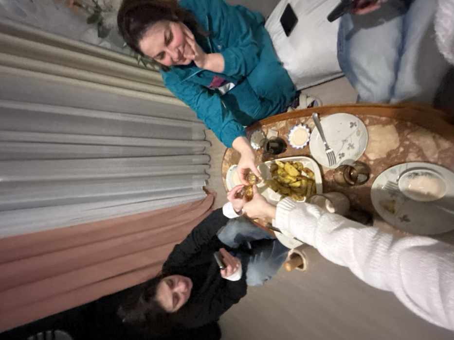 An indoor scene depicts three individuals gathered around a small, oval table with a mottled brown and pink marble-like top. Visual evidence does not permit confirmation of the location as Strasbourg, France. On the left, a female with dark hair, wearing a black long-sleeved top and blue jeans, holds a smartphone, looking down at the screen. On the right, a female with dark hair pulled back, wearing a teal tracksuit, smiles while resting her chin on her left hand. Her right hand extends towards the center of the table. Partially visible in the foreground is the arm of a third individual, wearing a white cable-knit sweater, whose hand is also extended. The hands of the person in the foreground and the person on the right are positioned to clink or share small, round, golden-wrapped chocolates. The table holds a white oval dish filled with roasted potato wedges. Multiple small white bowls contain creamy sauces. Two dark-colored glasses, one partially filled with a dark liquid, are also present. White plates with a subtle floral pattern and silver forks are arranged on the table. A cream-colored mortar and pestle set is situated to the left of the potato dish. In the background, vertical curtains in shades of light peach and translucent white are visible. A white upholstered seating area, possibly a sofa, is on the right, where a black smartphone is resting. The flooring appears to be light-colored wood.