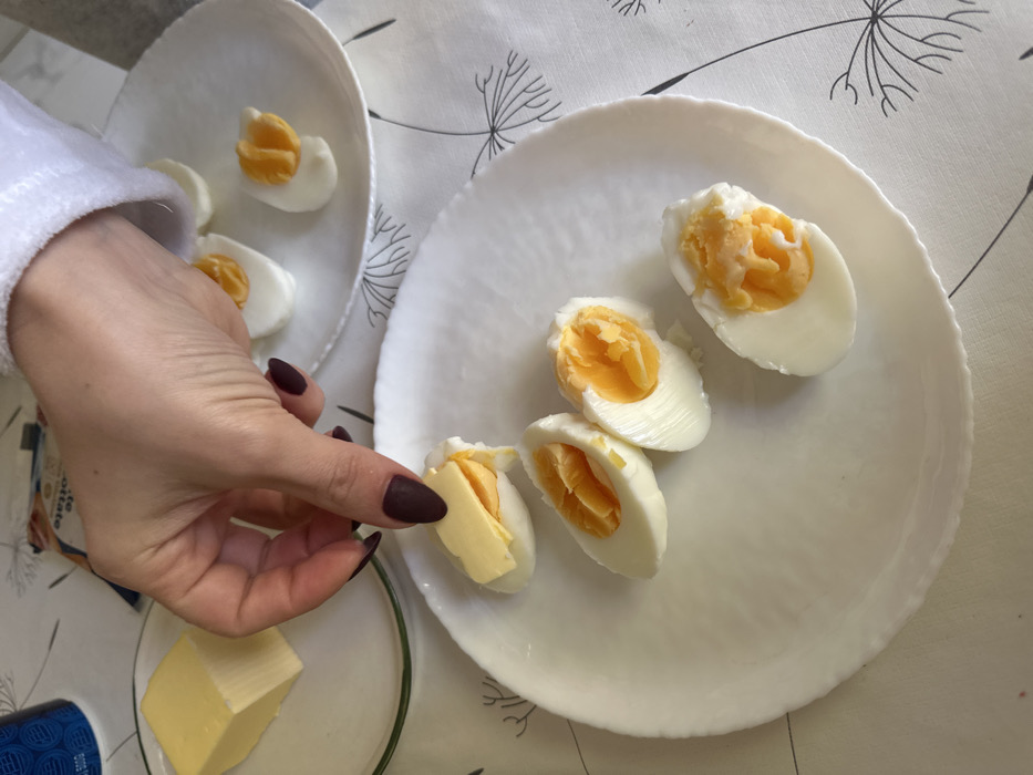 The scene is set on a tabletop in a domestic environment within the city of Yerevan, Armenia. A Caucasian right hand, with fingers featuring dark maroon nail polish, is centrally positioned, actively placing a thin, rectangular slice of light-yellow butter onto the exposed yolk of a halved hard-boiled egg. The hand's wrist is partially covered by a white, textured fabric sleeve. The egg receiving the butter is one of four hard-boiled egg halves arranged on a white, scalloped-edge circular plate in the foreground. These eggs exhibit firm, orange-yellow yolks. In the upper-left portion of the image, a second white, scalloped-edge plate displays a larger, irregular block of light-yellow butter. Adjacent to this plate, a segment of a blue cup with white ornamentation is visible, along with a blurred light-colored package containing indiscernible text. A third white, scalloped-edge plate is partially visible in the upper-right background, holding two additional hard-boiled egg halves. The entire surface is covered by a light-colored fabric tablecloth patterned with stylized black outline illustrations resembling dandelion seed heads. The lighting is bright and uniform.