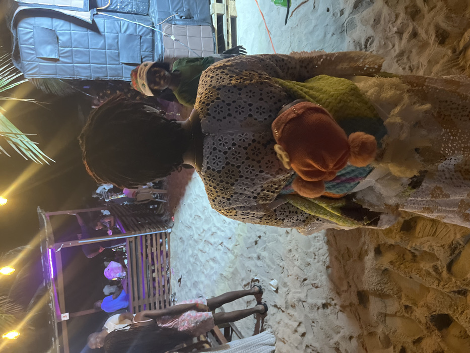 A nighttime beach scene reveals a person with dark hair in a lacey top holding an orange toy. Another person in a green shirt and festive hat stands behind them. In the background, illuminated by string lights, people sit under a makeshift wooden structure, creating a casual outdoor gathering spot. The ground is sandy, and the warm lighting suggests a relaxed, informal atmosphere.