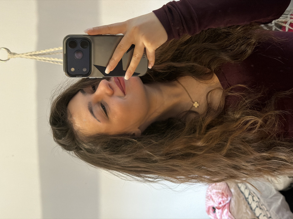 The scene is an indoor mirror selfie taken in the city of Bouxwiller, France. A young adult female, with long, wavy brown hair, is positioned from the chest up, looking towards her left with a slight smile. She wears a dark red, long-sleeved top with a V-neck and a thin gold-colored necklace featuring a small, flat, square cross pendant. Her right hand, holding a dark-colored smartphone, is prominent in the frame. The phone is encased in a dark protective cover displaying a lighter-colored star emblem and a multi-lens camera module. Her fingernails show light-colored manicures. The background consists of a plain, light-colored wall. In the upper right, a metal ring is visible with a light-colored braided cord hanging from it. Disorganized fabric, including pink and white material, is out of focus in the lower left background.
