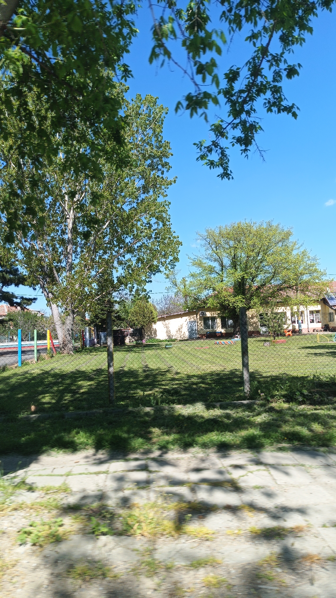 The image depicts an exterior view, possibly taken from a moving vehicle, of a park-like setting in Lozenets, Bulgaria, on a sunny day. A building, likely a kindergarten or small school, stands in the background with a beige facade and a roof tiled with orange terracotta. A chain-link fence separates the viewer from a grassy area dotted with trees. The shadows of trees are cast across the sidewalk or path in the foreground. Colorful playground equipment is visible in the building's yard. The sky is clear and blue.