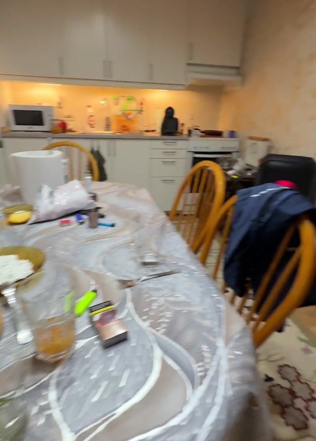 scene in a kitchen. A table with food, drinks, and cigarettes on it is the focal point. Around the table, a couple of people are seated, partially visible. The kitchen is equipped with standard appliances like a fridge, stove, and microwave. A large JBL speaker with pink lighting is positioned against the wall in the corner of the room. A blue jacket is draped over a chair next to the speaker.