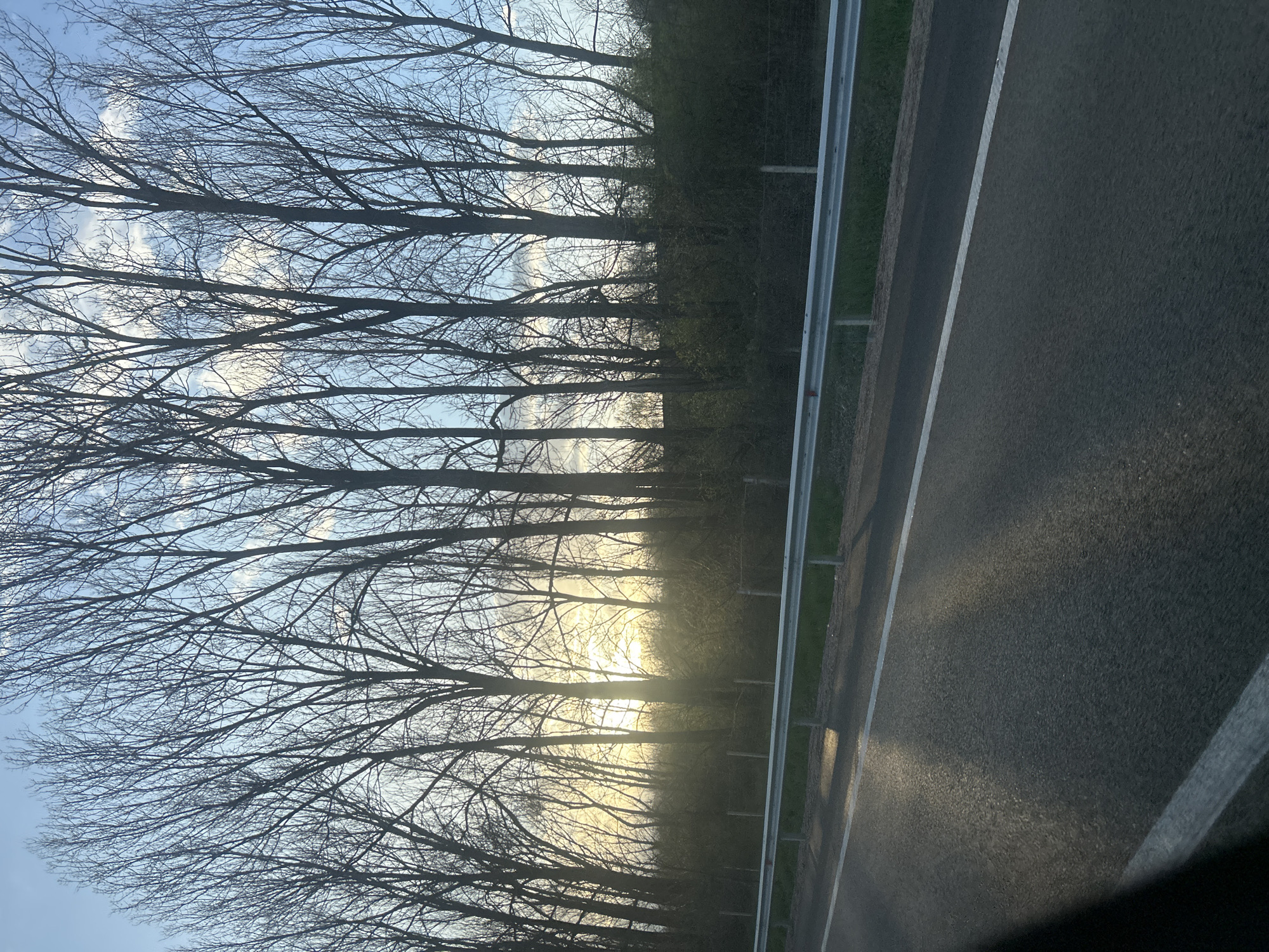 A roadside view shows a two-lane road with a silver guardrail separating it from a line of bare trees. Sunlight filters through the trees, creating a bright, hazy effect in the distance. The sky is a light blue with wisps of clouds visible through the branches. The image appears to be taken from a moving vehicle. The location is Dolni Bogrov, Bulgaria.