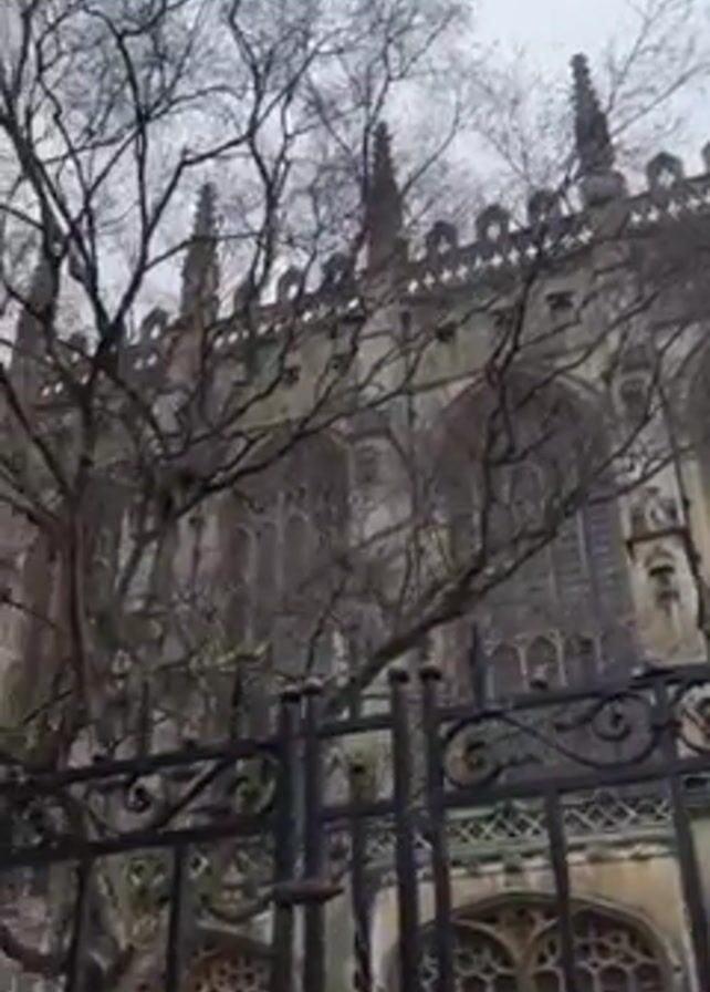 low-angle view of a tall, ornate building, likely a cathedral or college. The building is made of light-colored stone with gothic architectural features, including pointed arches, spires, and decorative stonework. There are bare trees in the foreground, partially obscuring the view of the building. A black wrought-iron fence runs along the front of the property. The sky is overcast and grey. The camera pans and moves slightly, showcasing different sections of the building's exterior. There are no people visible in the video.