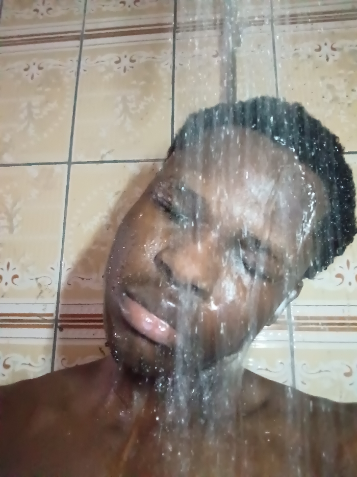 A close-up of a dark-skinned person standing in a shower with water cascading over them