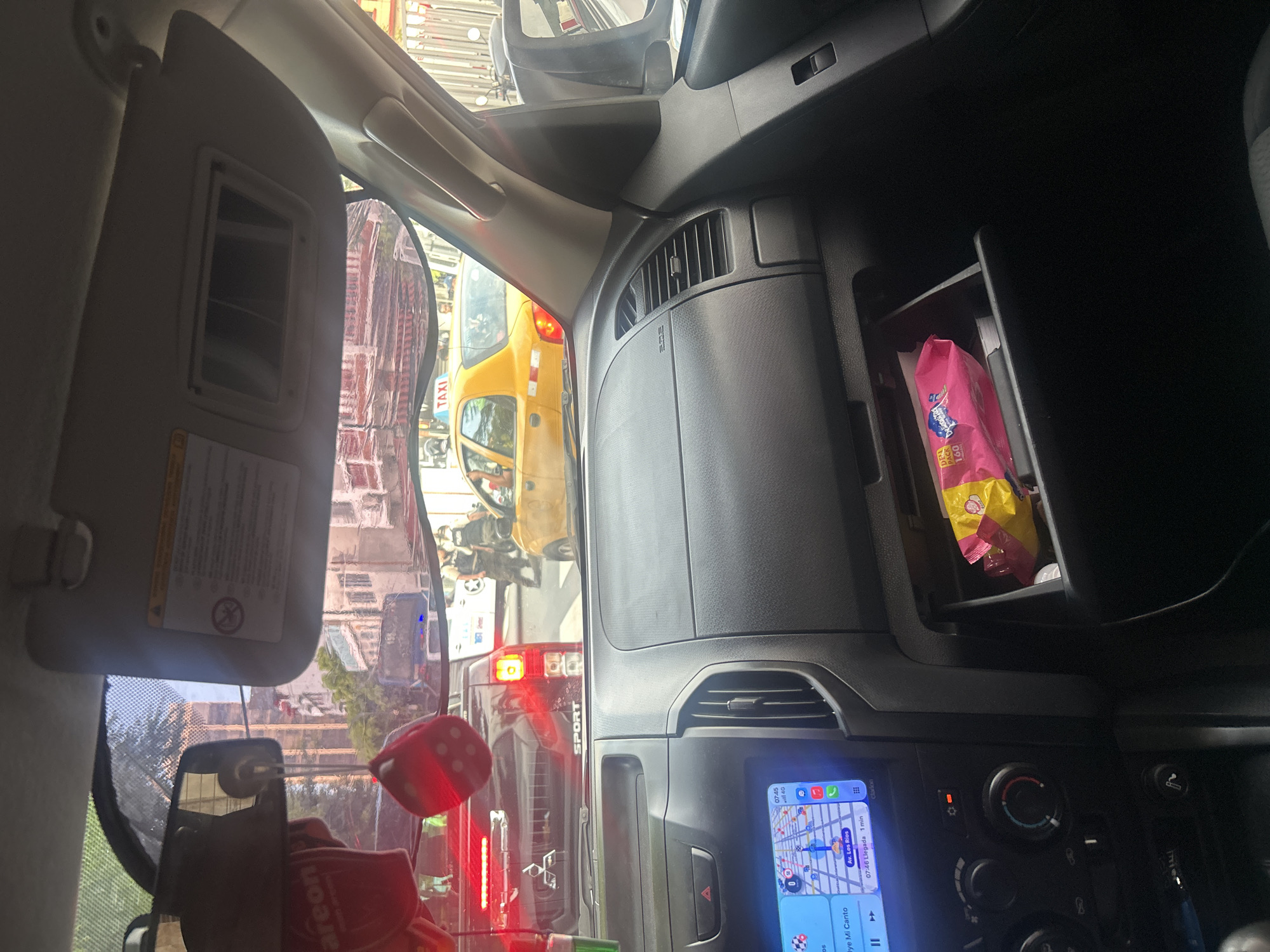 The interior of a vehicle, likely a car or truck, is viewed from the driver's seat. A sun visor is pulled down. An in-dash navigation system shows a map with a route highlighted. A bag of chips or snacks is visible in an open compartment. Outside the windshield, there is heavy traffic that includes a yellow taxi. Air fresheners hang from the rearview mirror. The navigation map displays a route along "Av. Los Rios", suggesting the location is in Guayaquil, Ecuador. The text "oye Mi Canto" is also visible on the display.