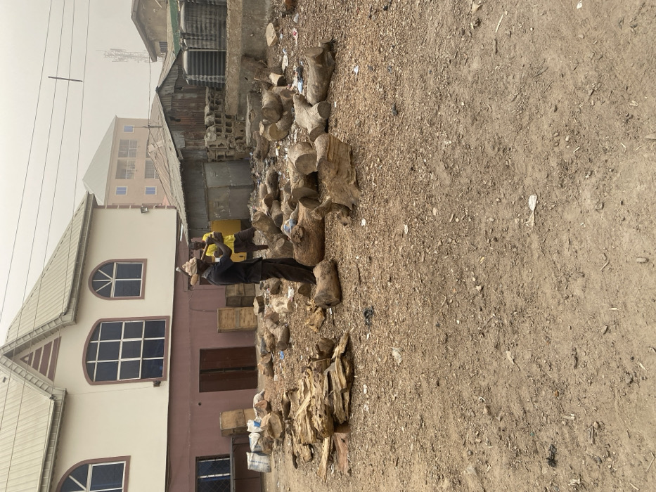 The scene depicts an outdoor wood processing or charcoal preparation area in Sabon Gari West, Nigeria, under an overcast and hazy sky