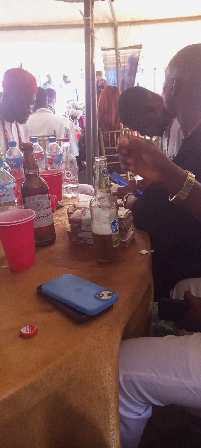 This image depicts a social gathering taking place under a large white tent structure in Nnewi, Nigeria. In the foreground, a brown table serves as the primary surface for various items. On the table, from left to right, are a red plastic cup, an empty Budweiser beer bottle, and several plastic water bottles, including "King Water" and "Manjero" brands. A stack of Nigerian Naira banknotes is present, next to a partially consumed bottle of "Flyer" or "Flynn" brand beer. A blue-cased iPhone rests face-up on the table, stacked upon a black mobile phone. A red Amstel bottle cap lies nearby. Two men are prominently positioned in the foreground. The man on the right, wearing a black shirt and a gold-colored wristwatch on his left arm, is engaged in handling the stacks of currency with both hands. His face is largely obscured in profile. The man on the left, partially visible, wears a red cap and a white garment with red beaded ornamentation; he appears to be looking downwards towards the table or an object in his hands. In the background, other individuals are visible, seated at tables with gold-colored chairs. Decorative elements, including white floral arrangements, are also discernible. The tent's support poles are visible, and the overall lighting suggests a bright, possibly daytime, environment under the canopy.