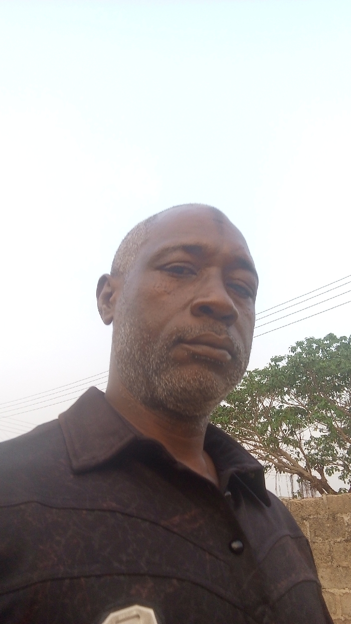 A middle-aged Black man with a graying beard and bald head is centered in the frame. He wears a dark button-down shirt with a collar. Behind him, a clear sky fades into a blurred background with a tree and some man-made structure. The image is slightly grainy, giving it a somewhat candid or casual feel. The focus is primarily on the man's face, highlighting his serious expression.