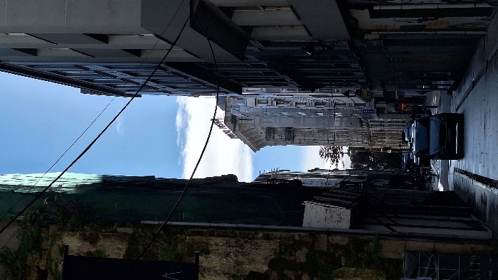 The image depicts a narrow urban street in A Coruña, Spain, oriented towards the Plaza de María Pita. The prominent white, ornate building visible in the distant background features a sign on its upper facade reading "PUERTO CHICO," confirming the location's proximity to the square. The scene is daylight, with the foreground and mid-ground cast in deep shadow, contrasting with the sunlit buildings and sky in the distance. Overhead utility lines cross horizontally at various heights. The street pavement is constructed from dark interlocking pavers, with a visible central drainage channel that appears wet. On the left, a tall, weathered building shows stone or concrete walls, partially obscured by green scaffolding netting or tarp, with some visible moss or vegetation. A dark, rectangular banner or sign is affixed to this building. On the right, a multi-story, dark grey modern-style building with multiple windows and balconies forms the opposing street wall. In the mid-ground, a dark-colored commercial van, appearing to be a Mercedes-Benz Vito or similar model, is positioned centrally in the street, facing away from the viewer. Its rear license plate is indistinct. Other vehicles are visible as blurred shapes further down the street. Several indistinct human figures appear as dark silhouettes walking in the sunlit background portion of the street. A tall, slender conifer tree is visible against the bright sky in the mid-distance. The sky is clear blue with scattered white clouds. No explicit actions or interactions are discernible beyond vehicular presence and pedestrian movement in the distance.