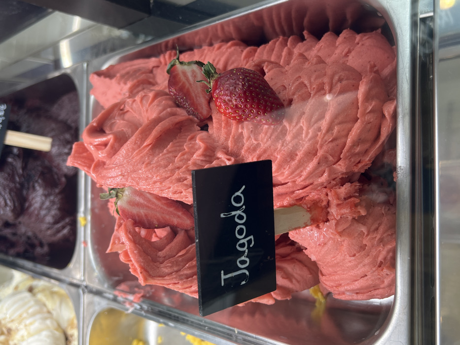 - "A stainless steel display pan is filled with bright red-pink strawberry gelato" by FM-9WVys2, licensed under CC BY 4.0