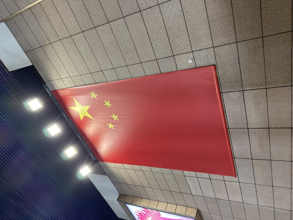 A large, vertically oriented fabric banner displaying the national flag of China hangs prominently against a light-brown tiled wall in an indoor environment within Pudong, China