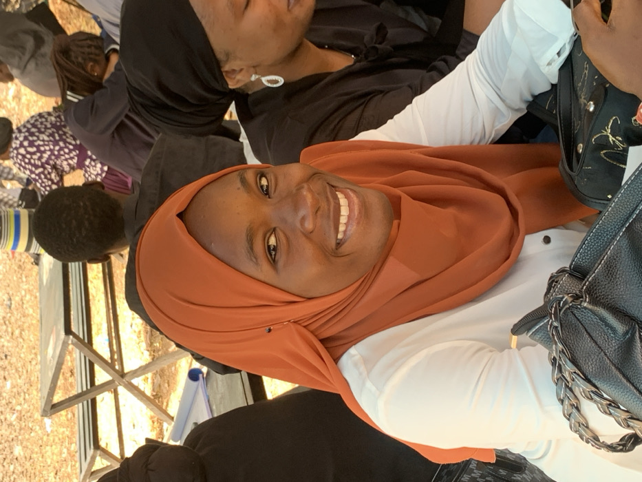 This image depicts an outdoor gathering in Apata Yakuba, Nigeria. In the foreground, a young adult female of African ethnicity occupies the central-left portion of the frame, looking directly at the viewer with a broad smile showing her teeth. She wears an orange-brown hijab and a white long-sleeved shirt. A small blue pin is visible on her hijab near her left temple. Her right arm is resting near two black bags: one with a prominent silver-colored braided strap and textured surface, and another, possibly a purse, featuring gold-colored patterns and a zipper. To the right of the primary subject, a second female, also of African ethnicity, is partially visible from the chest up, wearing a black head covering and a black garment. A silver-colored oval earring is visible on her left ear, and her head is angled downwards and to the right, away from the camera. The background shows additional individuals and environmental details. Directly behind the main subject, a person is seen from the back, wearing a black shirt. Further back, several people are seated, and metal folding tables and chairs are discernible. The ground appears to be light brown soil or sand. A blue rolled-up object, possibly a document or mat, is visible on a surface to the left in the mid-background. The scene is illuminated by natural daylight.