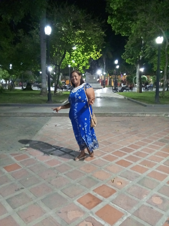 The image depicts a nighttime scene in a public park or plaza within Sabaneta, Venezuela. In the foreground, an adult female is positioned centrally, facing the camera and smiling. She wears a royal blue, full-length dress with white patterns and a white lace-like trim on the neckline. A light-colored, woven cross-body bag is slung over her left shoulder. Her right arm is slightly extended with an open hand, fingers spread, while her left hand is raised, displaying a "peace" sign gesture. She stands on a pathway paved with alternating reddish-brown and light grey square tiles arranged in a diagonal pattern. Her shadow is cast to her left and slightly behind her. The background reveals a well-lit park environment. Multiple tall, black lampposts with glowing white fixtures illuminate the area, casting bright light on the green foliage of numerous trees. Paved walkways are visible, and several dark-colored park benches are occupied by indistinct individuals further in the distance. Towards the mid-ground, a dark equestrian statue or figure on a light-colored rectangular pedestal is discernible. The overall environment suggests an active urban public space during evening hours.