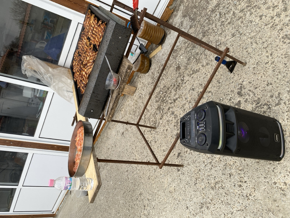 The scene depicts an outdoor food preparation and cooking area in Sredkovets, Bulgaria, set on a light-colored concrete or paved surface adjacent to a building
