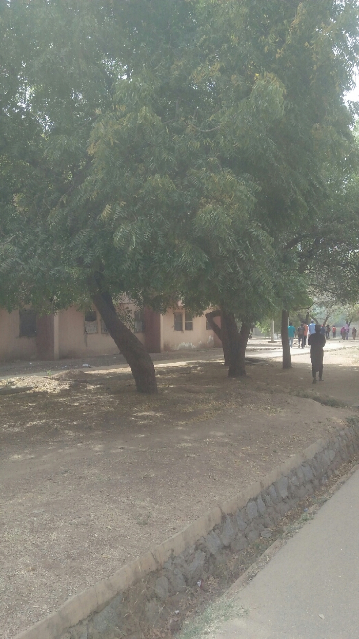 The image displays an outdoor scene in the city of Unknown, Unknown, under daylight conditions. The foreground consists of dry, light brown soil with scattered debris and sparse vegetation, shaded by two large, multi-trunked trees with dense green foliage. Behind these trees, a single-story building with a light-colored facade, possibly beige or pale orange, is visible. This building features multiple rectangular windows, some appearing dark or covered, others with visible frames. To the right, a paved road runs parallel to a concrete-lined drainage ditch. The ditch has a lower section constructed of rough stones and mortar, topped by a smooth concrete curb. One individual, dressed in dark, full-body attire that covers their head, is positioned in the mid-ground on the paved road, walking away from the camera, partially obscured by a tree trunk. Further down the road in the background, a group of approximately 5-7 individuals is visible. These individuals wear clothing of varied colors and appear to be walking or standing. No specific interactions among the distant group are discernible. The overall lighting suggests a bright day, with shadows cast by the trees.