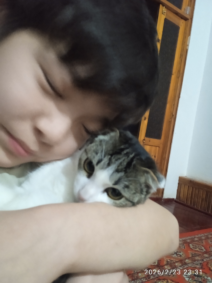 A child with closed eyes embraces a cat with folded ears. The cat has white and gray fur and gazes at the camera with big, round, gold eyes. The child's dark hair is cropped closely. In the background, a wooden-framed door with a small window and paneling is visible. The bottom right corner shows a timestamp reading "2026/2/23 23:31". A patterned rug appears at the bottom. The image is slightly blurry.