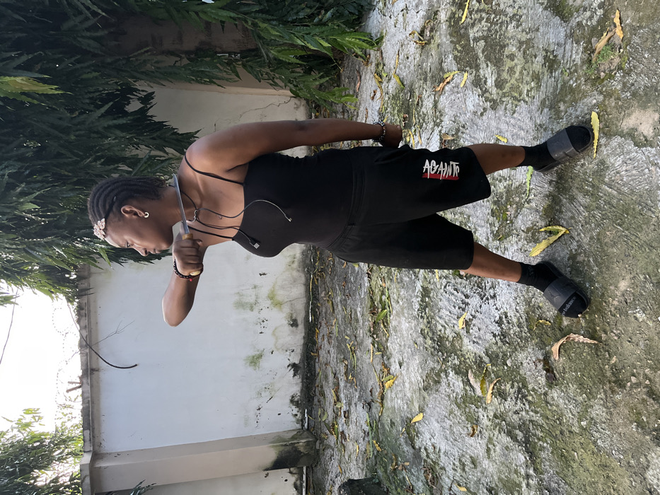 A person, appearing to be female, is depicted in profile, facing left, within an outdoor, semi-enclosed residential area in Lokoja, Nigeria. She stands on an uneven concrete surface strewn with dry yellow and brown leaves, showing patches of moss or mildew. The subject wears a black spaghetti-strap tank top, black athletic shorts with the word "ABANTR" visible in white and red lettering on the left thigh, black socks, and black New Balance slide sandals. Her hair is styled in dark, short braids, adorned with a light-colored, possibly rhinestone-studded, headband. She has a small silver hoop earring in her left ear and multiple beaded bracelets on both wrists. Black wired earphones hang around her neck, with the earpieces resting at her collarbone. She holds a knife in her raised right hand, positioned horizontally across her chest with the handle near her left shoulder and the metallic blade extending leftward. Her left hand is clenched into a fist at her side. Her gaze is directed straight ahead. In the background, a weathered, off-white concrete wall exhibits dark stains and dirt accumulation. Above the wall, barbed wire or razor wire is present. To the right, dense green foliage from a tree with long, slender leaves partially obstructs the background. The scene is illuminated by natural daylight.