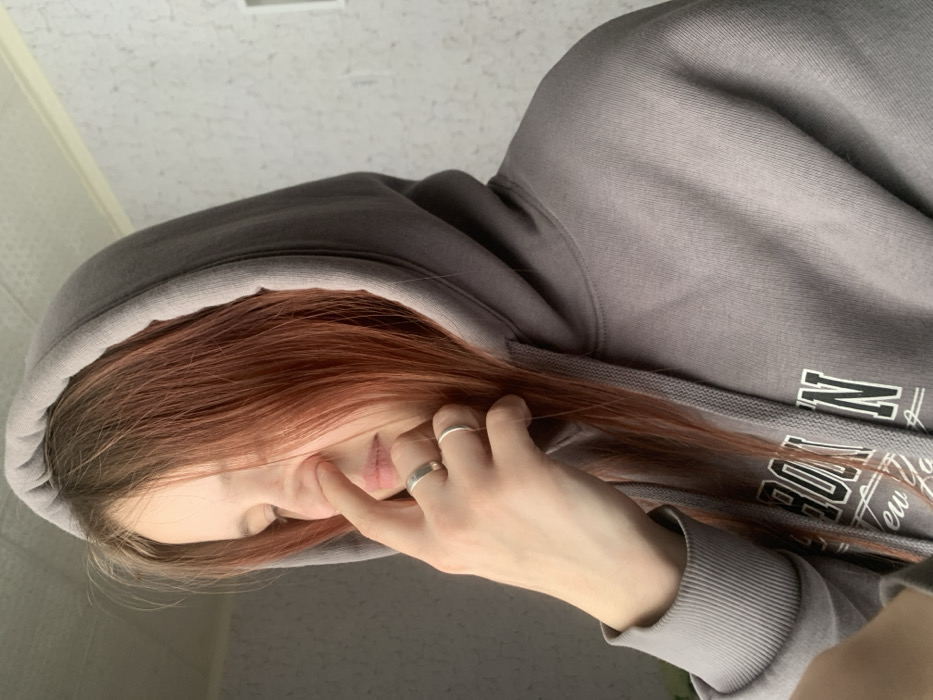 A young individual, appearing to be female, is depicted in a medium-close-up within an interior setting in Фоки, Russia. She has long, reddish-brown hair, partially framed by the grey hooded sweatshirt she is wearing, with the hood pulled up. Her right index finger is pressed against the tip of her nose, pushing it upwards. Two silver-colored rings are present on her right hand: one on the ring finger and one on the middle finger. Her eyes are directed downwards, and her lips are slightly parted. The grey sweatshirt features partially visible white text on the front, stating "BROOKLYN New York". The background consists of a light-colored wall with a subtle, textured pattern, indicative of wallpaper. The lighting is soft and ambient, primarily from the left.