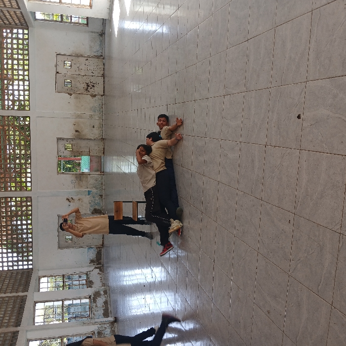 The image portrays an interior scene within a large, utilitarian room in Santa Ana, Venezuela. The room features a light gray tiled floor and off-white walls that exhibit significant staining and discoloration, indicating advanced wear. Multiple windows with visible grilles are present on the left wall, and two sets of double doors, also appearing aged and distressed, are situated in the background. An open doorway to the left of the double doors reveals partial external greenery. In the mid-ground, three individuals are positioned on the floor, lying supine in an overlapping arrangement. The lowest individual is on their back, oriented with their head towards the viewer's right, wearing a light-colored short-sleeved shirt and dark pants. A second individual is partially stacked atop the first, also on their back, with their head oriented towards the viewer's left, wearing similar attire and a bent left leg with a visible red shoe. The third individual is partially atop the second, on their back, with their head oriented towards the viewer's right, also in a light-colored shirt and dark pants. Standing centrally behind this group, a fourth individual faces away from the viewer, holding a black smartphone horizontally as if actively photographing or video recording the scene on the floor. This individual wears a light-colored short-sleeved shirt and dark pants. A single wooden chair is positioned directly behind them. On the far left, a fifth individual is partially visible and blurred due to motion, walking leftward out of the frame, wearing a light-colored top and dark pants. The interaction suggests the documentation of a staged event or exercise.