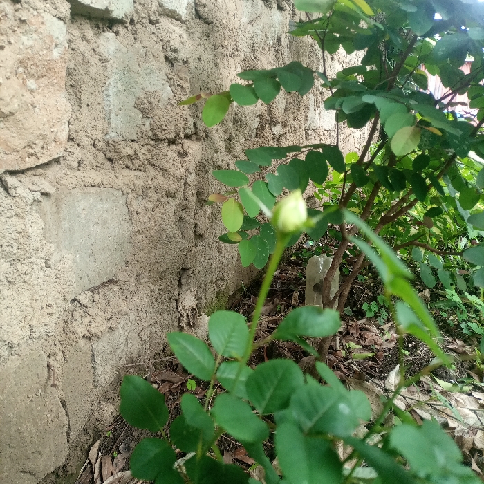 The scene is an outdoor setting located within the city of Kimorori/Wempa ward, Kenya. On the left, a vertical wall constructed from irregularly shaped, light-colored, rough-hewn stone or concrete blocks with visible mortar lines occupies the frame. To the right of the wall, a plant with small, ovate, dark green leaves is prominent in the foreground and midground. A single, undeveloped, light yellow-green flower bud, approximately 1.5 cm in length, extends upwards from a slender stem near the center of the image. Behind this, a denser green shrub with numerous small, elliptical leaves and visible branches is present. The ground beneath the foliage consists of dark soil with scattered dry leaves and minimal ground cover. A small, light-colored, rectangular object, possibly a stone or marker, is partially visible on the ground beneath the foliage. No individuals, animals, or specific actions are depicted. The lighting indicates natural daylight conditions.