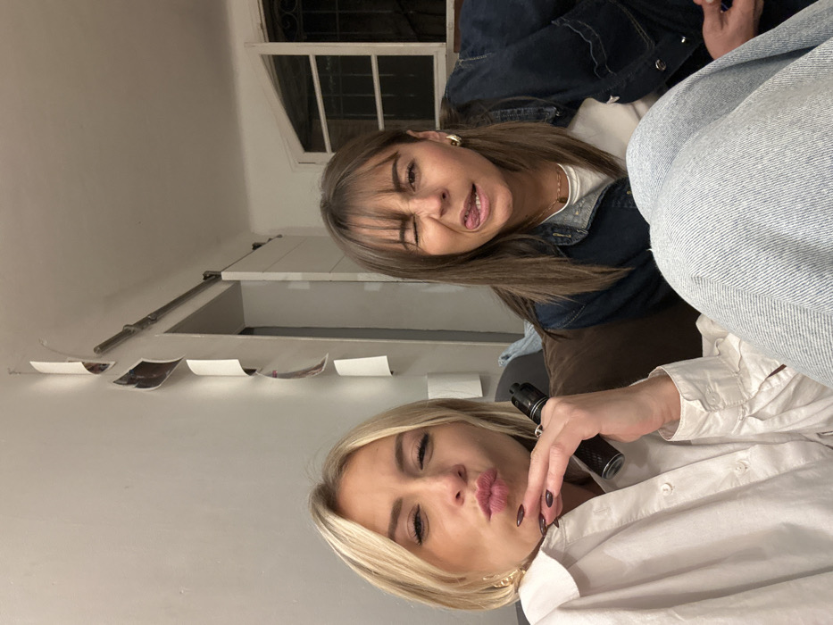 Two women pose together. The woman at the top has long brown hair and wears a denim jacket. She makes a face, sticking her tongue out slightly. The woman at the bottom has short blonde hair and wears a white button-down shirt. She puckers her lips. She holds a black cylindrical object. A window and a door in the ceiling are visible in the background. There are also multiple white pieces of paper on the wall.