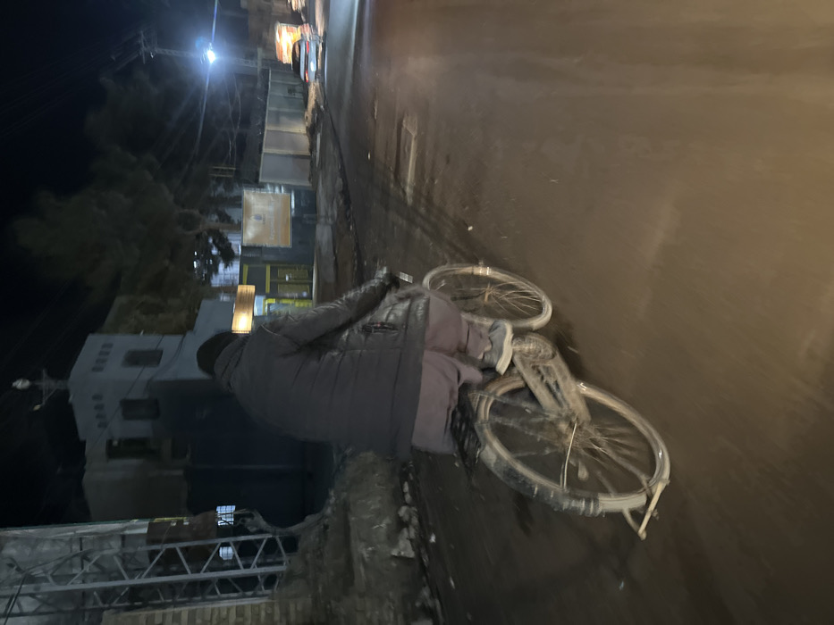 At night, a person in a dark jacket stands with a bicycle on the side of a dark street. The bicycle is old with visible wear. Buildings line the opposite side of the street, illuminated by streetlights. The pavement is dark and reflective, suggesting it may be wet. A fence is visible in the foreground. The scene is dimly lit.