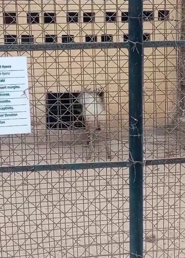 striped hyena inside a fenced enclosure. The hyena is light brown with dark stripes and has a short mane. It is standing near a dark opening in the back of the enclosure. A sign is visible on the left side of the fence, providing information about striped hyenas. The enclosure is made of a metal fence and has a dirt floor. The background shows a yellow brick wall with a grid-like pattern of openings. The lighting is natural, and the video appears to be taken during the day.