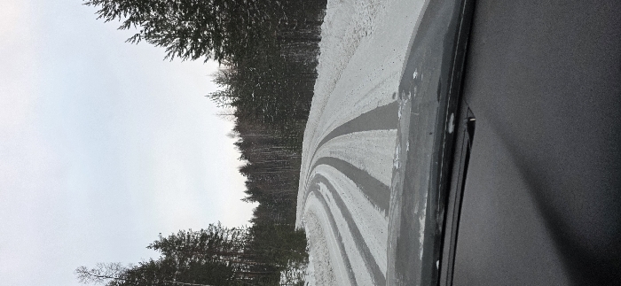 A wintry road curves sharply, marked by tire tracks cutting through a layer of fresh snow. Dense trees line the road, their dark forms contrasting against the overcast sky. The view is partially obstructed by a portion of a car's interior, likely where the picture was taken from. The landscape evokes a sense of cold and quiet isolation.