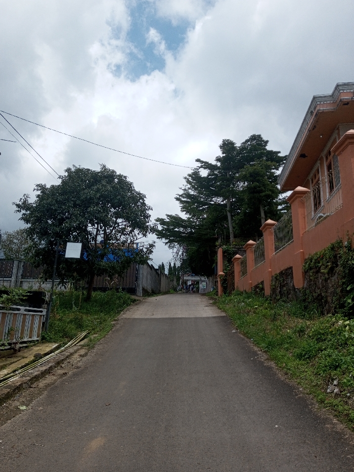 The image depicts an uphill asphalt road in Ura-Dozhi, Bhutan, under a partially overcast sky with visible patches of blue. The road, lacking visible markings, ascends into the distance, flanked by vegetation and structures. On the left side of the road, a large deciduous tree with dense green foliage stands in the mid-ground. A white rectangular sign is affixed to a pole positioned in front of this tree. Further left and partially obscured, a low, light-colored slatted fence is visible in the foreground, adjacent to a dirt verge and utility lines. Behind the tree, a grey concrete block wall and another building are partially discernible. Utility wires traverse the upper portion of the frame, running horizontally across the sky. On the right side of the road, a two-story building with peach-colored walls and a dark grey roofline is prominently featured. The second story has windows with white frames and security grilles. A matching peach-colored fence with decorative pillars and black metal railing runs along the property line, situated atop a stone retaining wall covered with green growth. Further down the road on the right, several tall evergreen trees are visible. Green grass and weeds line both edges of the road. In the far distance, where the road appears to curve or crest, several indistinct human figures are discernible. No specific actions or interactions are clearly identifiable.