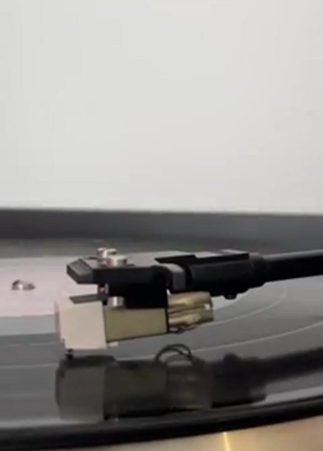 A close-up shot shows a turntable playing a vinyl record. The tonearm, in black, is positioned over the record, with the cartridge and stylus visible. The record is black and glossy. The background is a plain white surface. The camera is static, and the focus is on the tonearm and stylus in contact with the record. The lighting is bright.