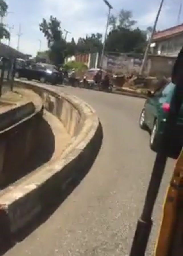 ride in a yellow tuk-tuk or auto-rickshaw, traveling on a paved road. The road curves to the left, alongside a concrete drainage ditch. Other cars, taxis, and tuk-tuks are visible on the road. The tuk-tuk passes underneath an overpass. The camera faces forward, then turns to show the back of the driver, wearing a beige hoodie with the word "WEBER" on the back. The weather is sunny.