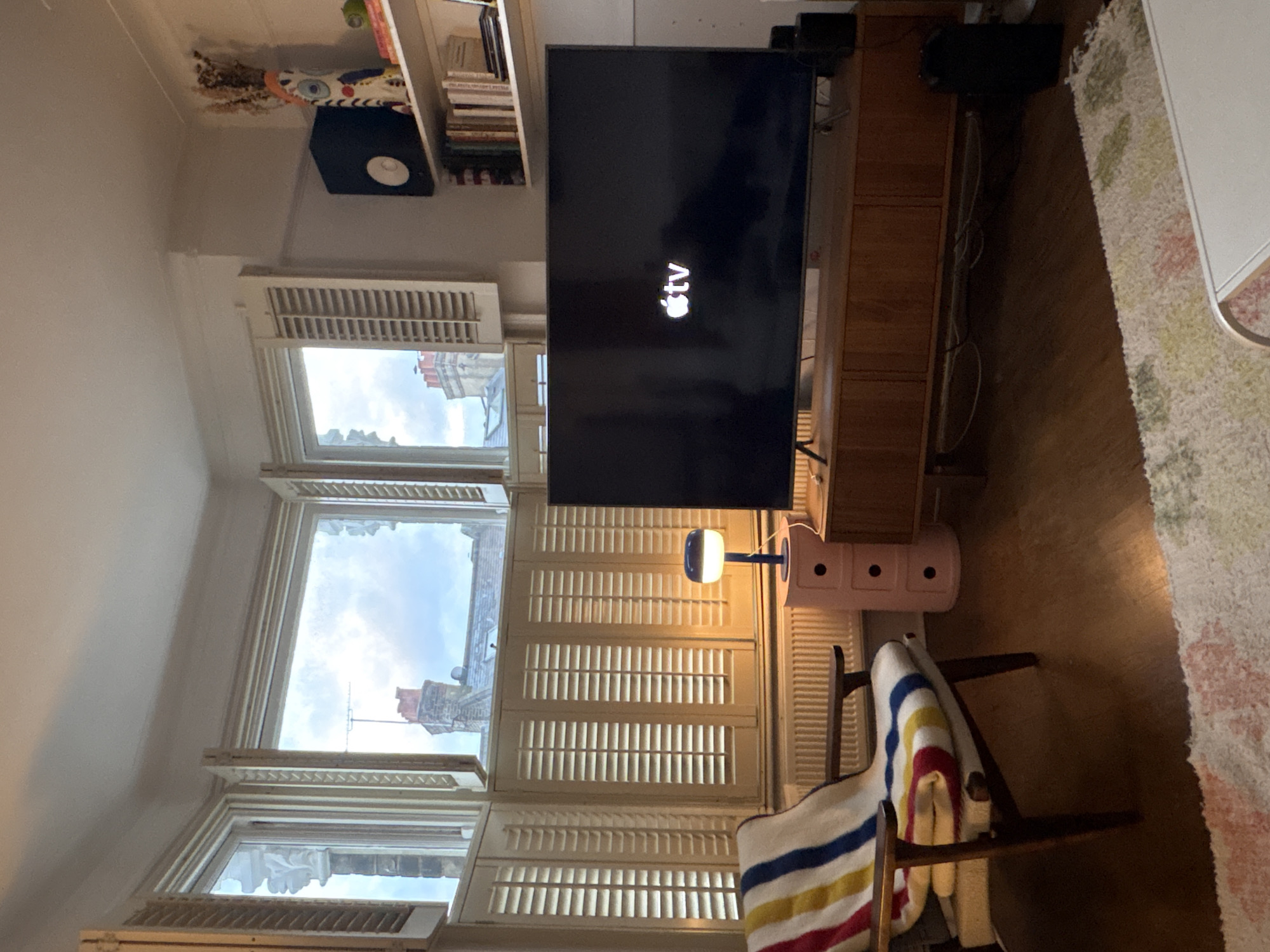 A bright living room in a London apartment features large windows with closed shutters. The room is furnished with a modern TV, a pink bedside table, a chair draped with a striped blanket, and a bookshelf. Exterior views visible through the windows show neighboring buildings. The Apple TV logo is displayed on the screen.