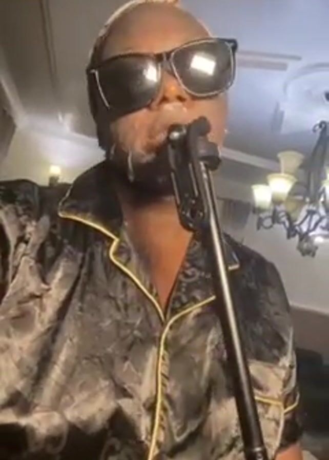 A person is standing in front of a microphone stand wearing black sunglasses, a black and gold patterned pajama top, and a patterned head wrap. They have a white substance on their face around their mouth. The background shows a chandelier, a glimpse of a sofa, and a curtained window. The person is speaking into the microphone, and there is slight movement and adjustment of the head wrap.