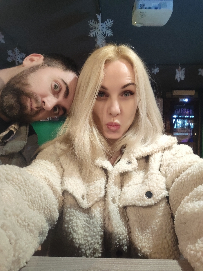A selfie features a blonde woman puckering her lips, wearing a fluffy cream jacket. A bearded man leans into the frame from the left, his face close to hers and gaze directed toward the camera. Snowflake decorations adorn the dark ceiling above. A "GARAGE" sign is faintly visible in the background. The setting appears to be a casual indoor space.