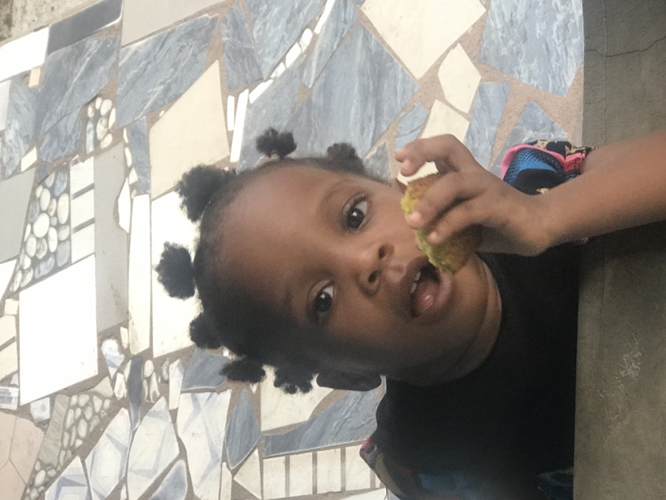 A young child with dark hair styled in small buns is shown holding a greenish-brown snack, possibly a falafel or fritter, and appearing to take a bite