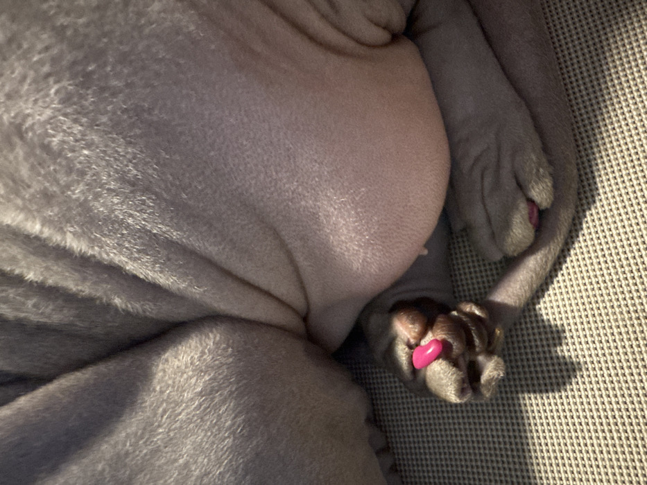 A gray, wrinkly dog is lying on a textured surface. The dog's belly and paws are prominently displayed. The dog has had its nails painted pink. The overall image is close-up and focuses on the dog's skin and limbs.