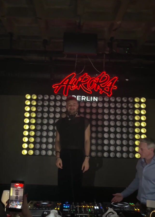 Here's a plain text description of the video: A DJ wearing a black sleeveless shirt and black pants stands behind a DJ booth at a club called "Aurora Berlin." He raises his arms and brings his hands to his face, posing for the crowd. Behind him is a backdrop of circular lights and a red neon sign that reads "Aurora Berlin." People in the crowd are holding up their phones, recording the DJ. Another person in a blue shirt stands to the right of the DJ booth, seemingly assisting. The ceiling has an exposed concrete texture.