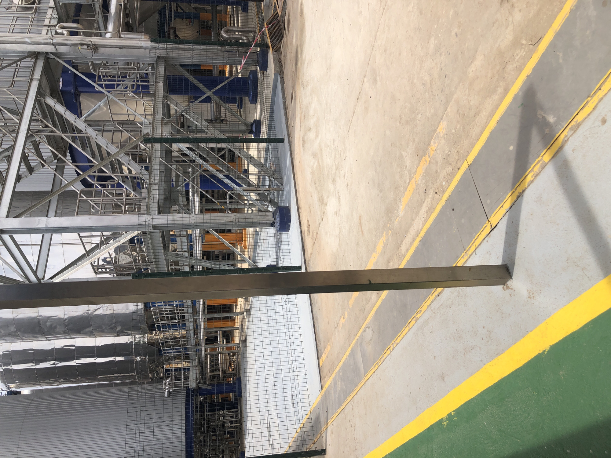The image depicts an outdoor industrial facility located in Sabon Gari Nassarawa, Nigeria, under bright daylight. The foreground features a concrete ground surface, partially paved in light brown/tan with sections of grey and a distinct green area on the left. Yellow painted lines demarcate these sections and outline a central grey strip running horizontally. A vertical silver metal post stands in the mid-foreground, casting a shadow. A grey mesh wire fence with green vertical supports extends across the midground, separating the foreground from an inner area paved with lighter grey concrete. Behind this fence, a complex array of industrial equipment is visible. This includes multiple tall, cylindrical, silver-colored tanks or silos, some appearing clad in reflective material, interconnected by an extensive network of metal piping. A multi-level structural framework of metal beams, platforms, and stairs, predominantly silver, supports these elements, with some supports featuring blue bases. A corrugated metal wall is visible on the far left. On the far right, a broom leans against a structure, and a segment of red and white striped warning tape is partially visible on the ground. No individuals are present in the scene.