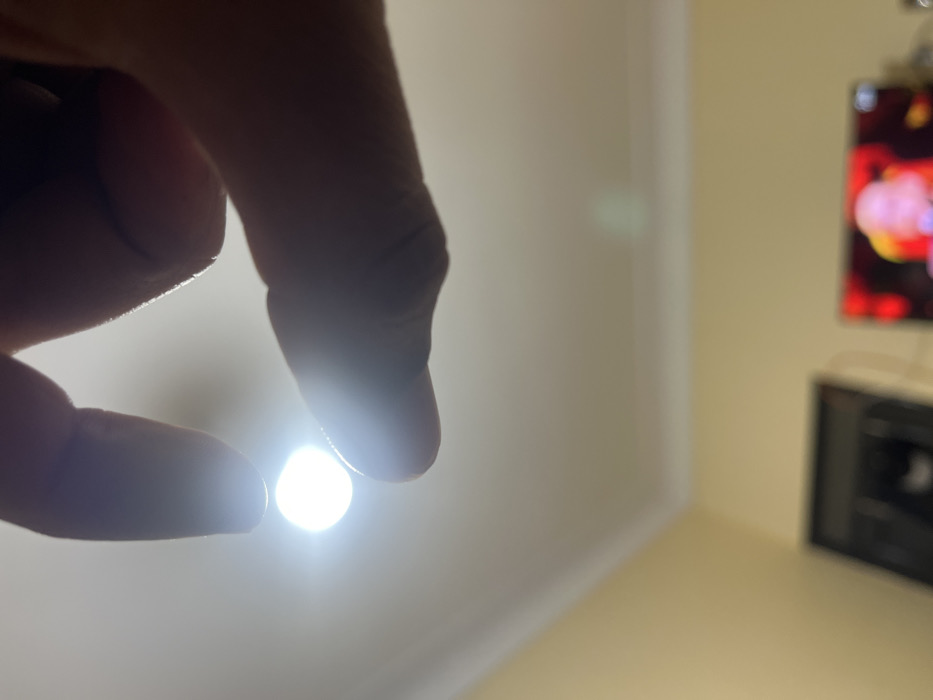 A close-up captures a hand seemingly holding a bright light source between its fingers. The background includes a blurred wall, a television displaying colorful visuals, and a black entertainment unit, all contributing to a simple indoor scene. The overall impression is one of focusing on the isolated light and the hand interacting with it.