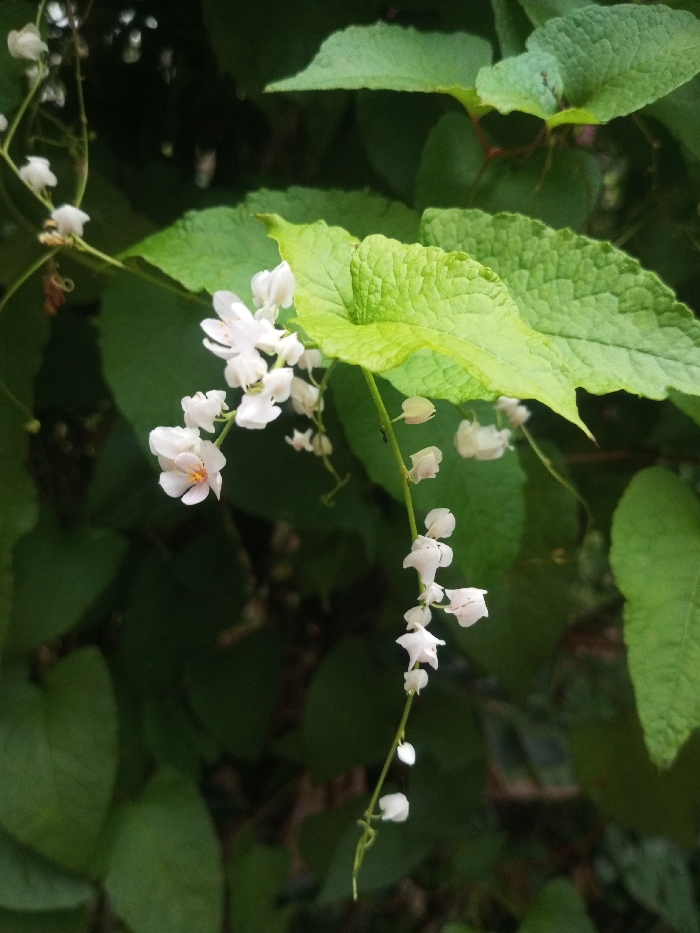 The image displays a detailed close-up of a flowering vine located in Tecuci, Romania. The primary subjects are multiple small, white flowers, arranged in clusters along slender green stems. Several of the open blossoms feature subtle pale-orange centers. These flowers are situated among and partially obscured by a dense arrangement of green, veined leaves. The leaves exhibit varying shades of green, with some appearing lighter and more textured in the foreground, while others are darker and less defined in the background. A single black ant is present on a flower stem on the right side of the frame. The scene is lit by diffuse natural light, creating a shallow depth of field that keeps the foreground elements sharp while softly blurring the background foliage.