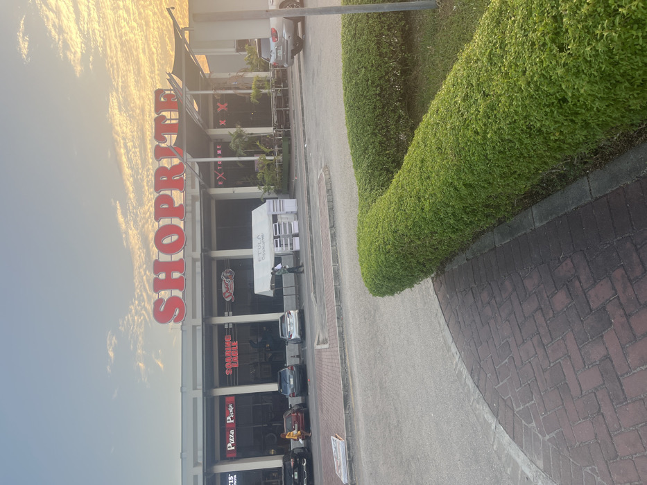 shopping center building with a prominent "SHOPRITE" sign. There are various storefronts, including "Pizza Pasta" and "Gaming Eagle." A white booth is set up in front of the building. Several cars are parked on the street. A neatly trimmed hedge runs alongside a brick-paved walkway. The sky is visible in the background, displaying a mix of blue and a golden hue. The image is rotated to the left.