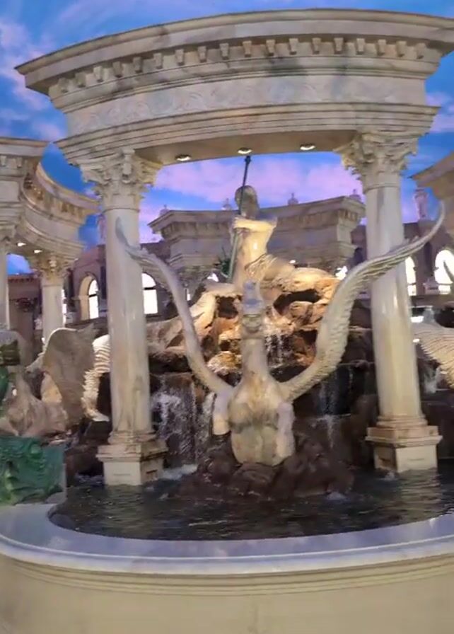 large, ornate fountain featuring Greco-Roman style statues, including figures with wings and sea creatures, set within an environment that mimics an outdoor scene with a painted sky above