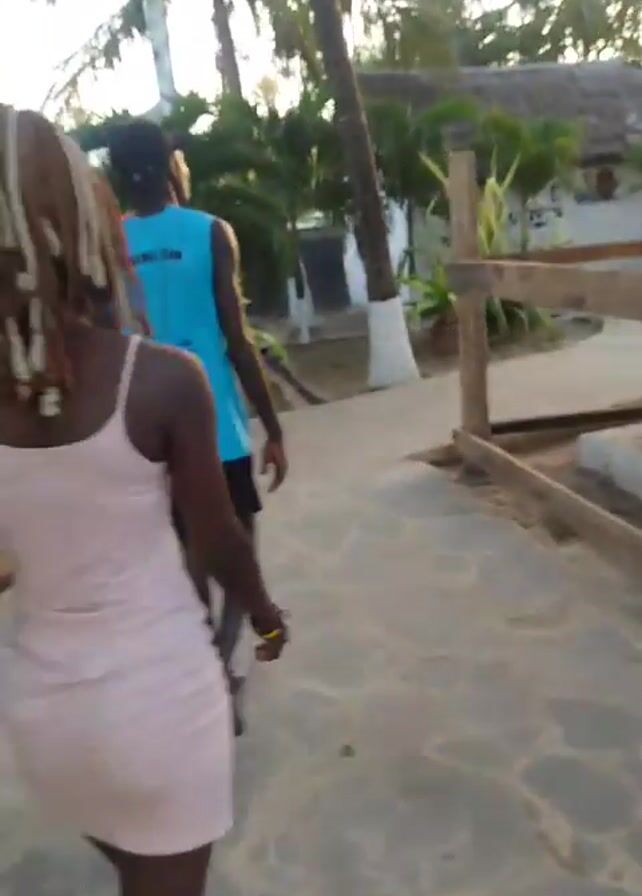 Two people are walking on a paved area near a beach. The person closest to the camera wears a light pink dress. The other person is wearing a blue tank top and dark shorts. Palm trees are visible in the background, and there is a white building on the right. The sun is visible, creating a glare in the video. There are some wooden planks and posts, possibly forming a construction project. A person in a black dress walks across the back of the scene.