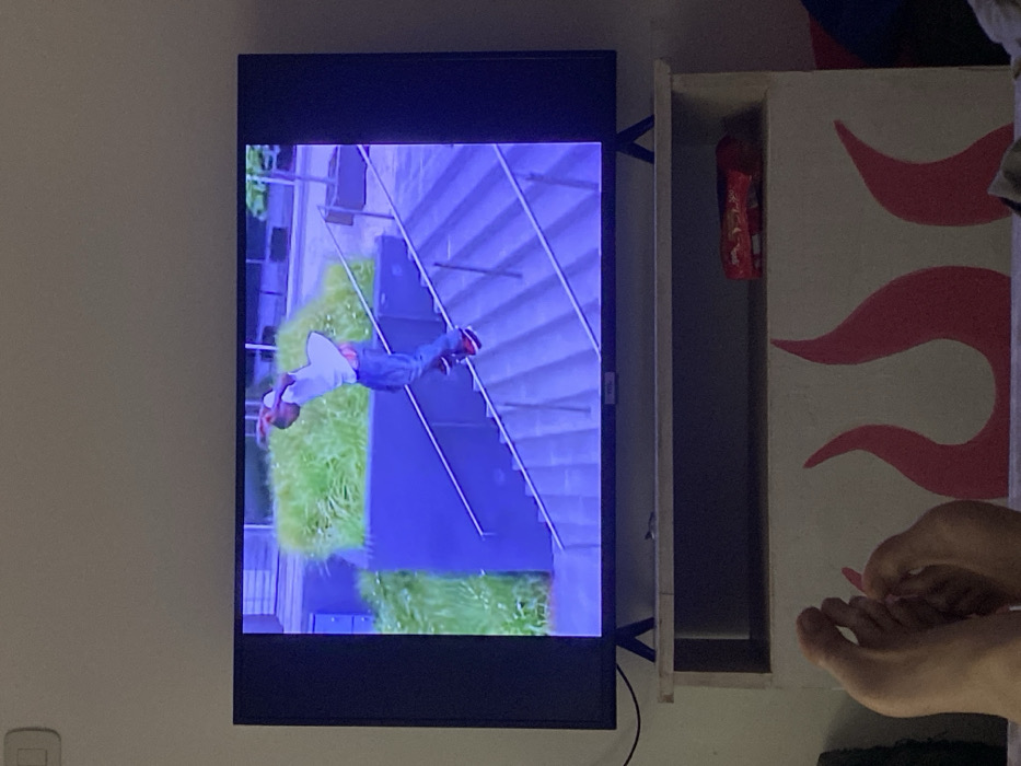 A TV displays a scene of a person walking down stairs beside a grassy area. The TV is mounted on a wall next to a partially open white cabinet decorated with red flame patterns. A red snack bag is visible inside the cabinet. In the bottom right corner, a pair of bare feet are visible. A cable hangs from the bottom of the TV. A light switch is on the wall to the left.