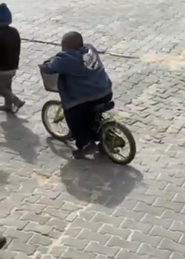 child riding a small green bicycle on a paved area. The child is wearing a blue jacket and black pants. There are other people walking around in the background. The paved area is made of gray bricks. The video is taken from a high angle.