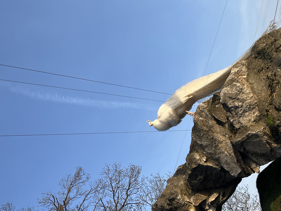 - "An albino peacock stands prominently on a rugged, light-colored rock formation, positioned in the lower-middle and right sections of the frame" by FM-Pur1n2, licensed under CC BY 4.0