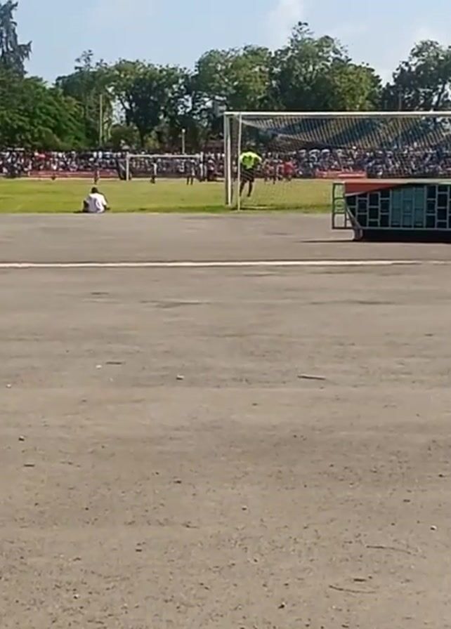 soccer game being played in a stadium filled with spectators. A lone individual sits on the sidelines. A scoreboard stands on the right side of the frame. A player in a neon green uniform is standing near the soccer net. The camera is positioned on an asphalt surface with a white line. Trees border the perimeter of the stadium. The sky is blue.