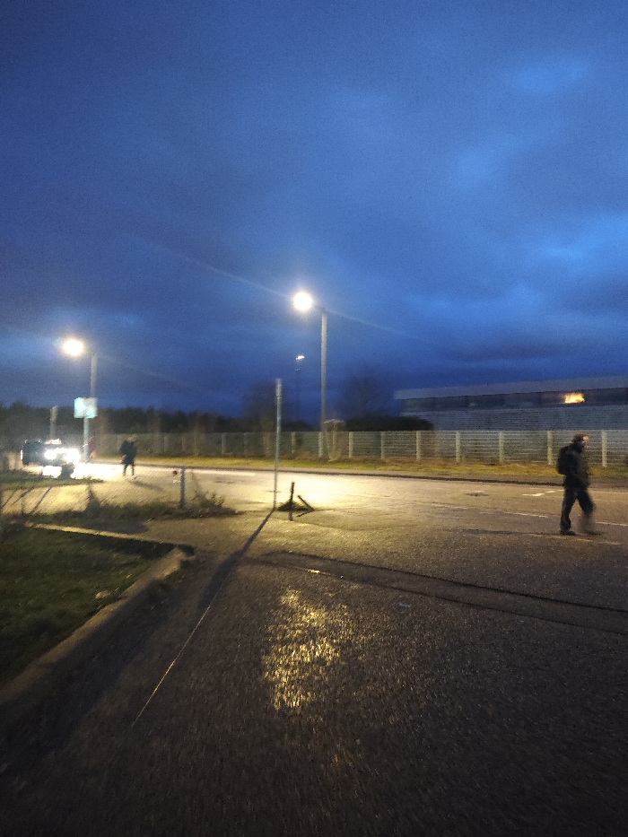 A nighttime scene shows a road illuminated by streetlights. A person walks along the road, while another figure stands further down near a car. The sky is a deep blue, suggesting twilight or early evening. A fence and building are visible in the background, indicating an industrial or commercial area. The road surface appears wet, reflecting the streetlights.